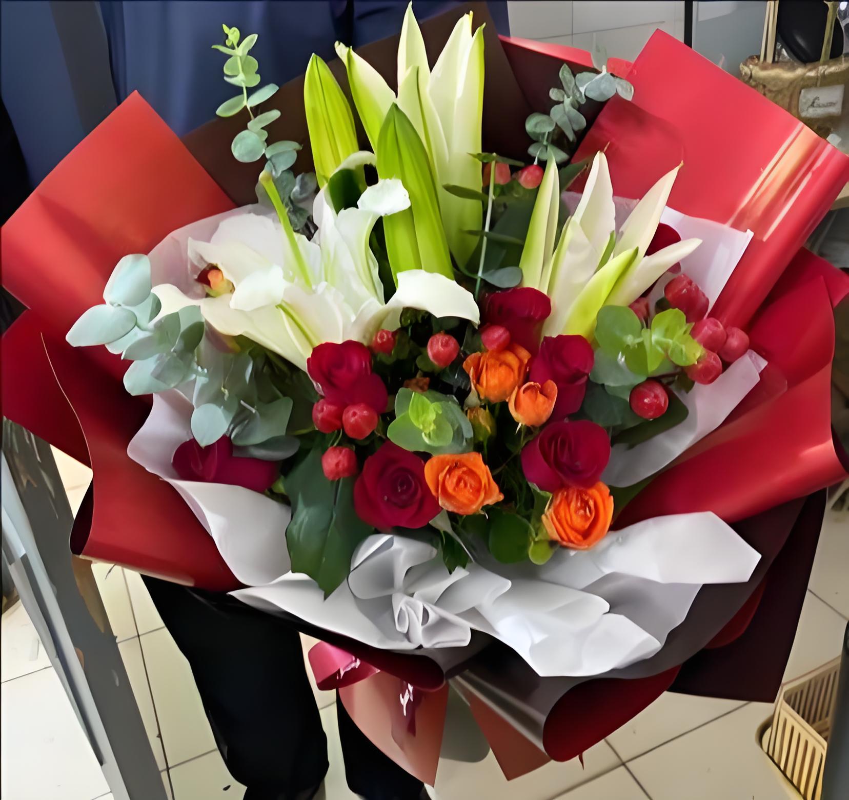 恩施州利川市花店包11枝红玫瑰、2枝多头白百合、6枝橙色多头玫瑰、红豆、尤加利叶